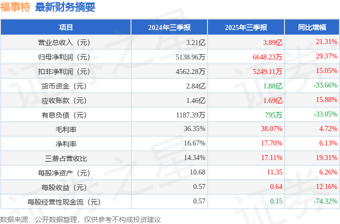 据证券之星公开数据整理,近期福事特(301446)发布2025年三季报。截至本报告期末,公司营业总收入3.89亿元,同比上升21.31%,归母净利润6648.23万元,同比上升29.37%。按单季度数据看,第三季度营业总收入1.33亿元,同比上升36.24%,第三季度归母净利润1708.98万元,同比上升40.8%。本报告期福事特盈利能力上升,毛利率同比增幅4.72%,净利率同比增幅6.13%。