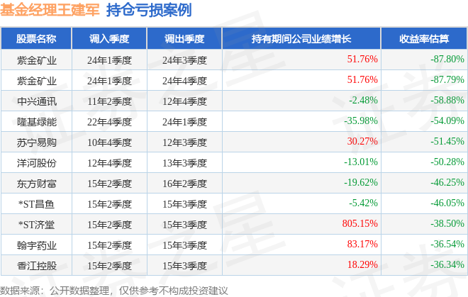 王建军管理的易方达量化策略A基金在24年1季度买入紫金矿业,在持有2个季度后在24年3季度卖出。持有期间的估算收益率为-87.8%,持有期间紫金矿业在2023年到2024年的年报归属净利润增幅达51.76%。