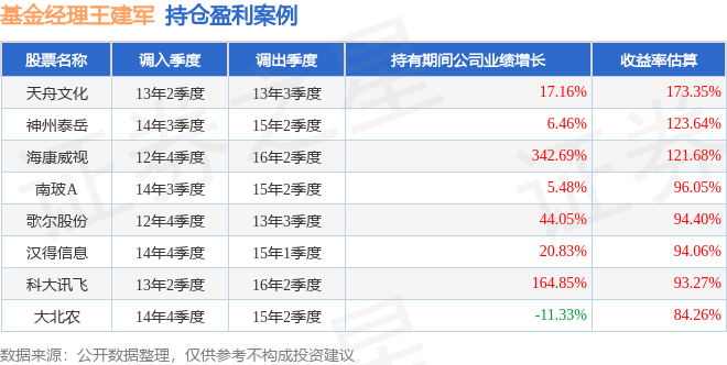 王建军管理的易方达创业板ETF联接A基金在13年2季度买入天舟文化,在持有1个季度后在13年3季度卖出。持有期间的估算收益率为173.35%,持有期间天舟文化在2012年到2013年的年报营业总收入增幅达17.16%。