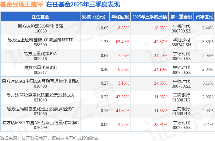 证券之星消息,截止2025年三季度末,基金经理王建军旗下共管理8只基金,本季度表现最佳的为易方达上证科创板100增强策略ETF(588500),季度净值涨42.37%。