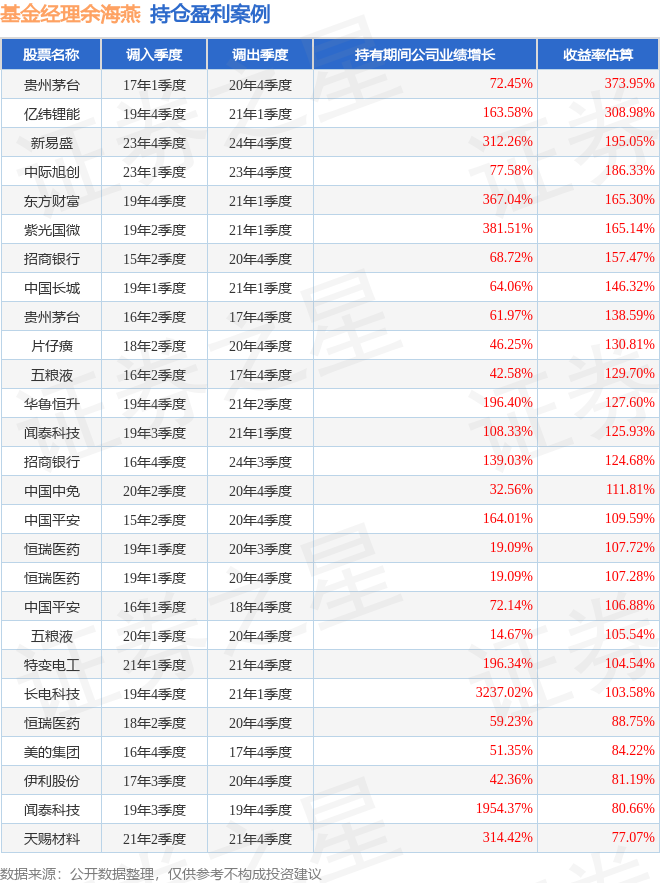 以下为余海燕所任职基金的部分重仓股调仓案例:
