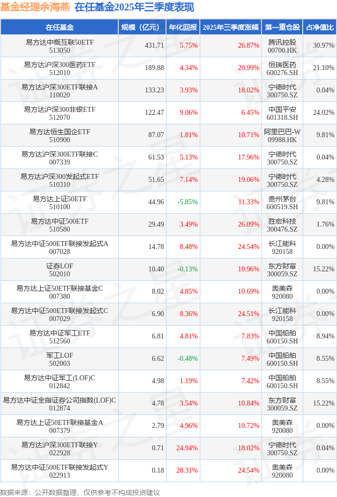 证券之星消息,截止2025年三季度末,基金经理余海燕旗下共管理20只基金,本季度表现最佳的为易方达中概互联50ETF(513050),季度净值涨26.87%。