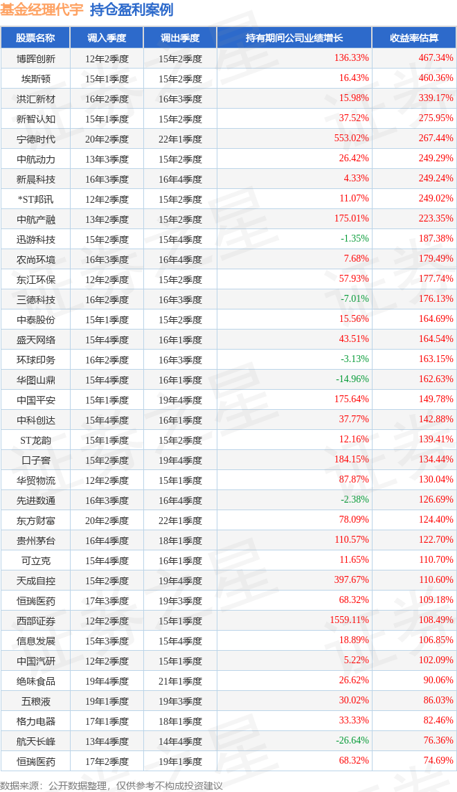 代宇管理的广发聚财信用债券A基金在12年2季度买入博晖创新,在持有3年又0个季度后在15年2季度卖出。持有期间的估算收益率为467.34%,持有期间博晖创新在2012年到2015年的年报营业总收入增幅达136.33%。
