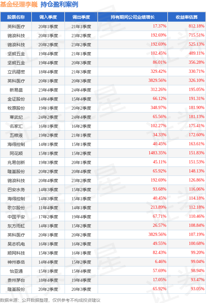 李巍管理的广发制造业精选混合A基金在15年3季度买入顺网科技,在持有2个季度后在16年1季度卖出。持有期间的估算收益率为99.2%,持有期间顺网科技在2015年到2016年的年报归属净利润增幅达82.43%。