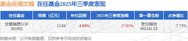 证券之星消息,截止2025年三季度末,基金经理沈楠管理的交银瑞思LOF(501092)季度净值涨17.01%。