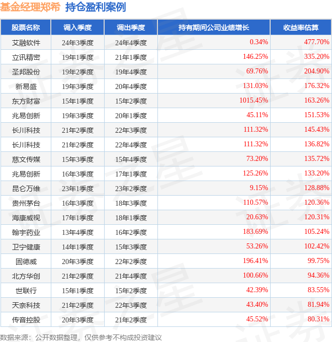 郑希管理的易方达北交所精选两年定开混合A基金在24年3季度买入艾融软件,在持有1个季度后在24年4季度卖出。持有期间的估算收益率为477.7%,持有期间艾融软件在2023年到2024年的年报营业总收入增幅达0.34%。
