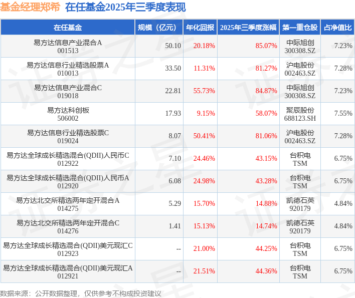 证券之星消息,截止2025年三季度末,基金经理郑希旗下共管理11只基金,本季度表现最佳的为易方达信息产业混合A(001513),季度净值涨85.07%。