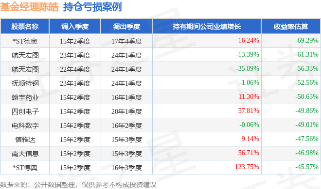 陈皓管理的易方达国防军工混合A基金在15年2季度买入*ST德奥,在持有2年又2个季度后在17年4季度卖出。持有期间的估算收益率为-69.29%,持有期间*ST德奥在2015年到2017年的年报营业总收入增幅达16.24%。