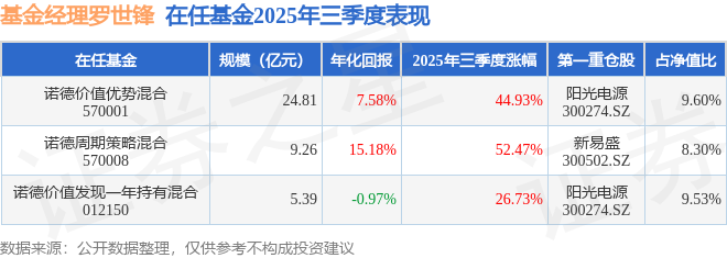 罗世锋管理的诺德价值优势混合基金在20年3季度买入阳光电源,在持有2个季度后在21年1季度卖出。持有期间的估算收益率为300.71%,持有期间阳光电源在2020年到2021年的年报营业总收入增幅达25.15%。