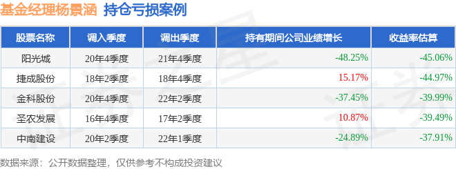 杨景涵管理的华泰柏瑞新金融地产混合A基金在20年4季度买入阳光城,在持有1年又0个季度后在21年4季度卖出。持有期间的估算收益率为-45.06%,持有期间阳光城在2020年到2021年的年报营业总收入降幅为48.25%。