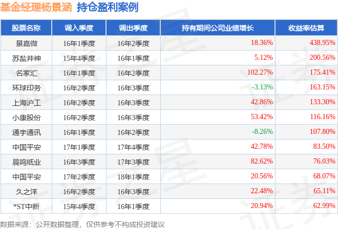 杨景涵管理的华泰柏瑞新利混合A基金在16年1季度买入景嘉微,在持有1个季度后在16年2季度卖出。持有期间的估算收益率为438.95%,持有期间景嘉微在2015年到2016年的年报归属净利润增幅达18.36%。