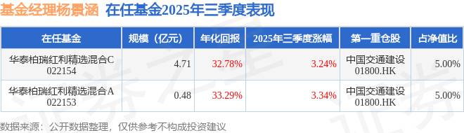 证券之星消息,截止2025年三季度末,基金经理杨景涵旗下共管理2只基金,本季度表现最佳的为华泰柏瑞红利精选混合A(022153),季度净值涨3.34%。