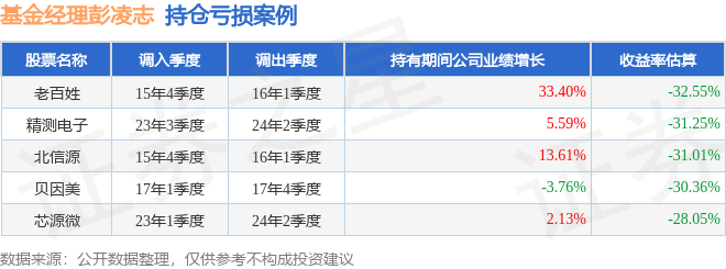 彭凌志管理的国泰新经济灵活配置混合A基金在15年4季度买入老百姓,在持有1个季度后在16年1季度卖出。持有期间的估算收益率为-32.55%,持有期间老百姓在2015年到2016年的年报营业总收入增幅达33.4%。