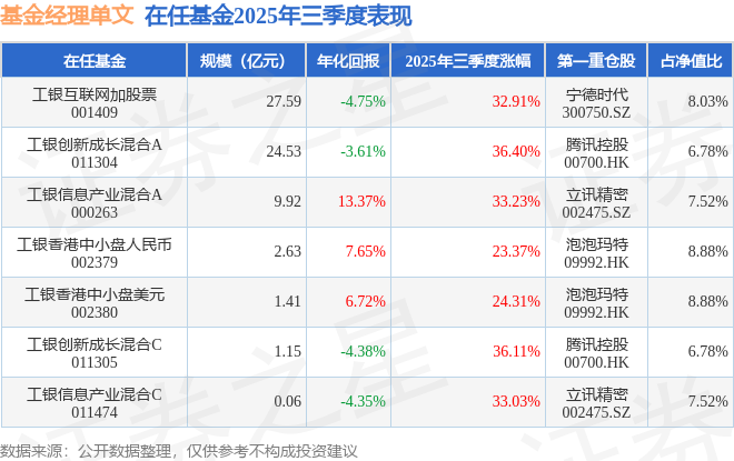 证券之星消息,截止2025年三季度末,基金经理单文旗下共管理7只基金,本季度表现最佳的为工银创新成长混合A(011304),季度净值涨36.4%。