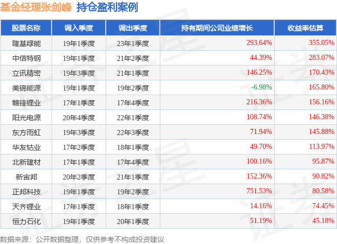 张剑峰管理的工银新材料新能源股票基金在19年1季度买入隆基绿能,在持有4年又0个季度后在23年1季度卖出。持有期间的估算收益率为355.05%,持有期间隆基绿能在2019年到2023年的年报营业总收入增幅达293.64%。