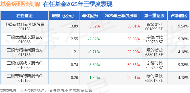证券之星消息,截止2025年三季度末,基金经理张剑峰旗下共管理5只基金,本季度表现最佳的为工银新材料新能源股票(001158),季度净值涨36.01%。