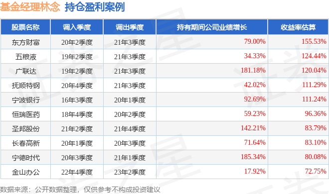 林念管理的工银红利混合基金在20年2季度买入东方财富,在持有1年又1个季度后在21年3季度卖出。持有期间的估算收益率为155.53%,持有期间东方财富在2020年到2021年的年报归属净利润增幅达79%。