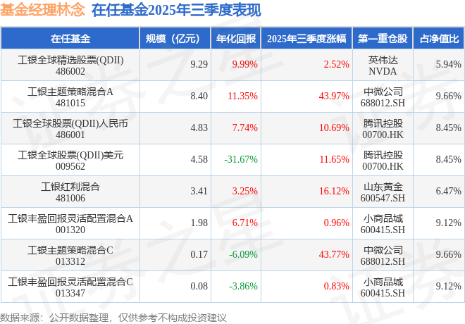 证券之星消息,截止2025年三季度末,基金经理林念旗下共管理8只基金,本季度表现最佳的为工银主题策略混合A(481015),季度净值涨43.97%。