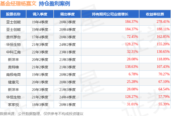 杨嘉文管理的易方达科汇灵活配置混合基金在19年4季度买入亚士创能,在持有3个季度后在20年3季度卖出。持有期间的估算收益率为278.41%,持有期间亚士创能在2019年到2020年的年报归属净利润增幅达184.37%。