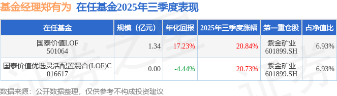 证券之星消息,截止2025年三季度末,基金经理郑有为旗下共管理2只基金,本季度表现最佳的为国泰价值LOF(501064),季度净值涨20.84%。