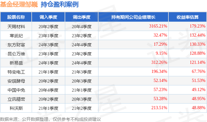 邹巍管理的中泰中证500指数增强A基金在20年2季度买入天赐材料,在持有2个季度后在20年4季度卖出。持有期间的估算收益率为179.23%,持有期间天赐材料在2019年到2020年的年报归属净利润增幅达3165.21%。