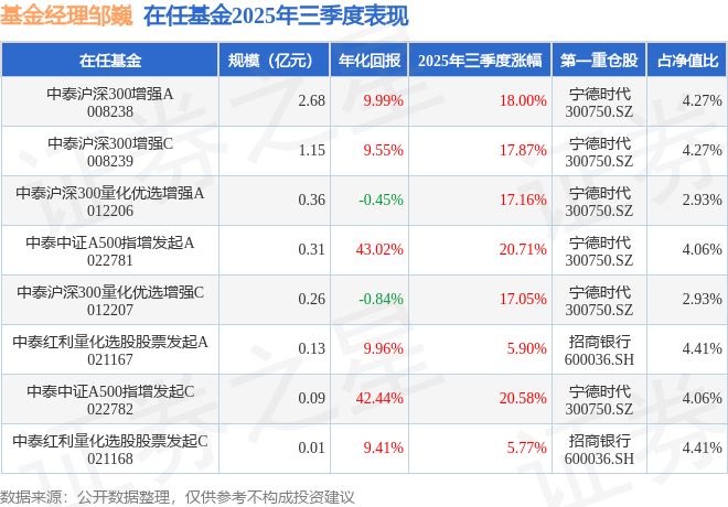 证券之星消息,截止2025年三季度末,基金经理邹巍旗下共管理8只基金,本季度表现最佳的为中泰中证A500指增发起A(022781),季度净值涨20.71%。