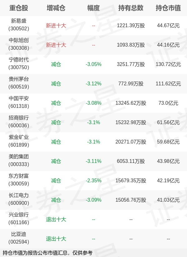 证券之星消息,10月28日易方达基金旗下余海燕 庞亚平管理的易方达沪深300交易型开放式指数发起式基金公布三季报,近1年净值增长率22.33%。与上一季度相比,该基金前十大重仓股新增新易盛,中际旭创;其中宁德时代持仓占比4.28%,为该基金第一大重仓股;兴业银行,比亚迪等退出前十大重仓股;详细数据如下: