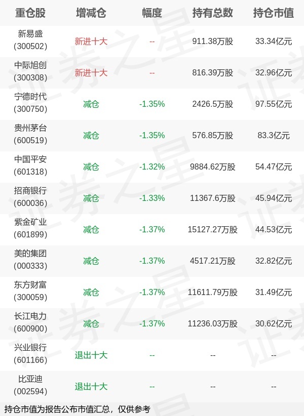 证券之星消息,10月28日华夏基金旗下赵宗庭管理的华夏沪深300交易型开放式指数基金公布三季报,近1年净值增长率22.23%。与上一季度相比,该基金前十大重仓股新增新易盛,中际旭创;其中宁德时代持仓占比4.28%,为该基金第一大重仓股;兴业银行,比亚迪等退出前十大重仓股;详细数据如下: