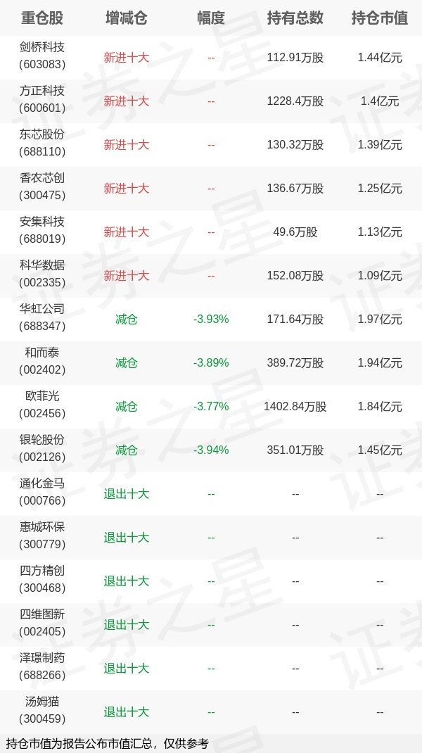 证券之星消息,10月28日广发基金旗下罗国庆管理的广发中证1000交易型开放式指数基金公布三季报,近1年净值增长率26.85%。与上一季度相比,该基金前十大重仓股新增剑桥科技,方正科技,东芯股份,香农芯创,安集科技,科华数据;其中华虹公司持仓占比0.56%,为该基金第一大重仓股;通化金马,惠城环保,四方精创,四维图新,泽璟制药,汤姆猫等退出前十大重仓股;详细数据如下: