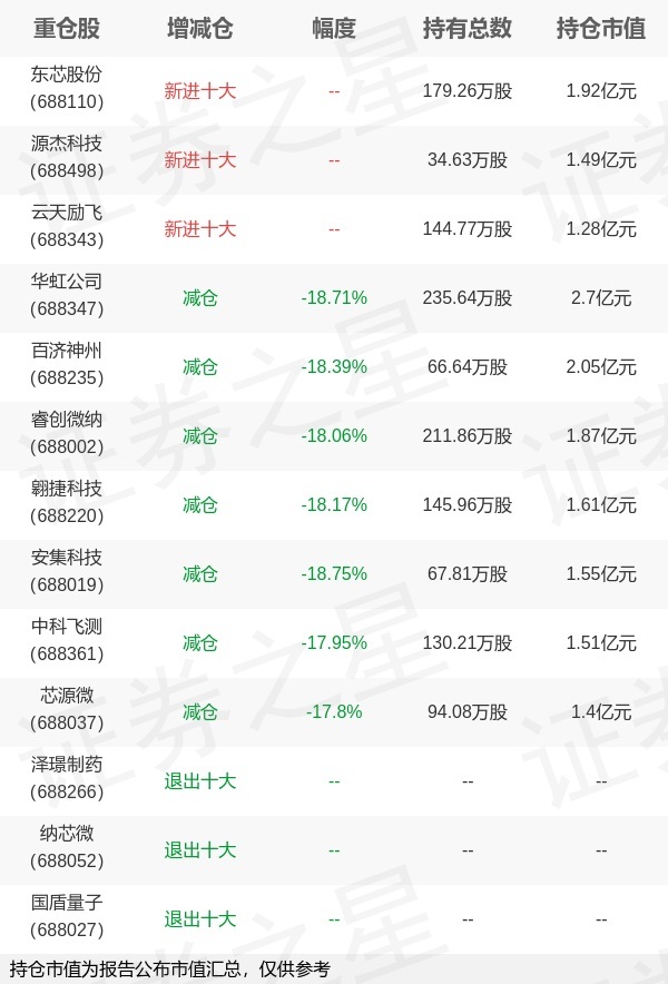 证券之星消息,10月28日博时基金旗下唐屹兵管理的博时上证科创板100交易型开放式指数基金公布三季报,近1年净值增长率49.58%。与上一季度相比,该基金前十大重仓股新增东芯股份,源杰科技,云天励飞;其中华虹公司持仓占比3.76%,为该基金第一大重仓股;泽璟制药,纳芯微,国盾量子等退出前十大重仓股;详细数据如下: