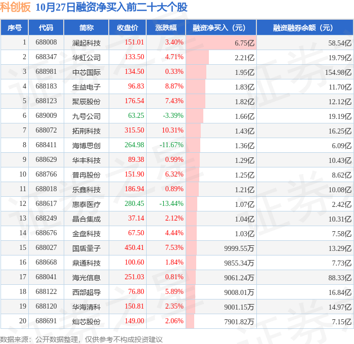 科创板融资净买入前三分别为:澜起科技(688008)融资净买入6.75亿元、华虹公司(688347)融资净买入2.21亿元、中芯国际(688981)融资净买入1.95亿元,前20具体见下表: