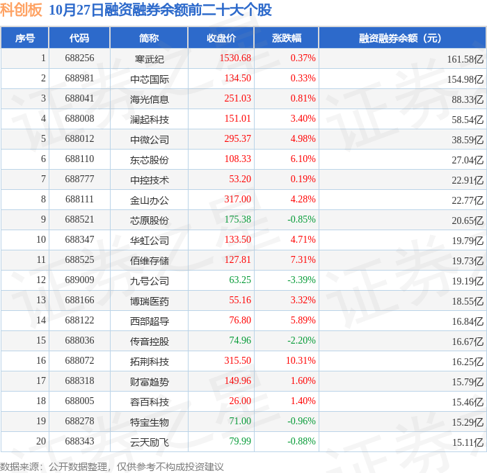 科创板融资融券余额前三分别为:寒武纪(688256)融资融券余额161.58亿元、中芯国际(688981)融资融券余额154.98亿元、海光信息(688041)融资融券余额88.33亿元,前20具体见下表: