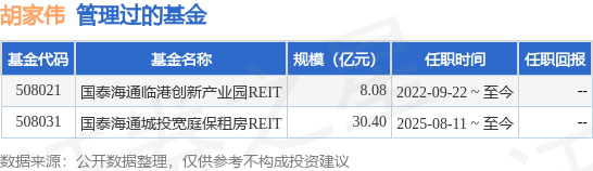 胡家伟先生:中山大学管理学学士。自2015年起先后任职于中外运化工国际物流有限公司、海航冷链控股股份有限公司、新宜(上海)企业管理咨询有限公司,从事园区运营及投资工作,在职期间负责上海、武汉、长沙、北京、天津等地物流基础设施项目投资开发及运营管理,2021年加入上海国泰海通证券资产管理有限公司,现任国泰君安临港创新智造产业园封闭式基础设施证券投资基金(2022年9月22日—至今)的基金经理。