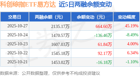 证券之星消息,10月27日,科创综指ETF易方达(589800)融资买入953.4万元,融资偿还298.52万元,融资净买入654.88万元,融资余额1414.27万元。
