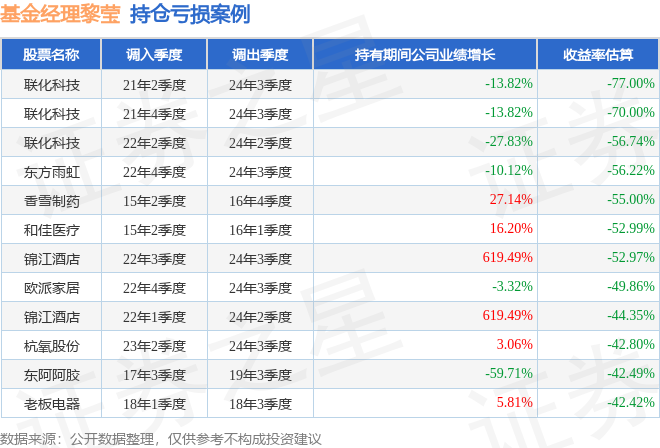 黎莹管理的德邦大健康灵活配置混合A基金在21年2季度买入联化科技,在持有3年又1个季度后在24年3季度卖出。持有期间的估算收益率为-77%,持有期间联化科技在2021年到2024年的年报营业总收入降幅为13.82%。
