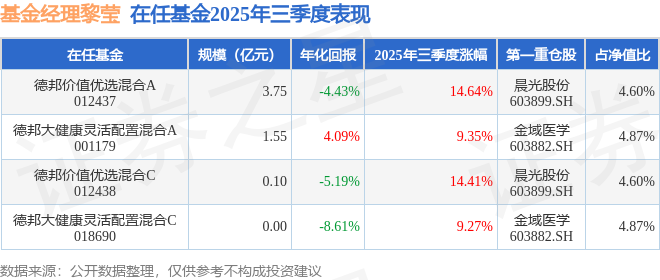 证券之星消息,截止2025年三季度末,基金经理黎莹旗下共管理4只基金,本季度表现最佳的为德邦价值优选混合A(012437),季度净值涨14.64%。