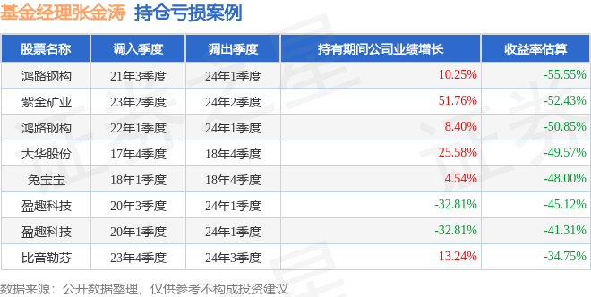 张金涛管理的嘉实领先优势混合A基金在21年3季度买入鸿路钢构,在持有2年又2个季度后在24年1季度卖出。持有期间的估算收益率为-55.55%,持有期间鸿路钢构在2021年到2024年的年报营业总收入增幅达10.25%。