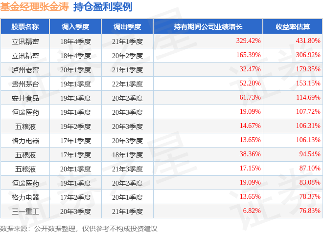 张金涛管理的嘉实沪港深精选股票基金在18年4季度买入立讯精密,在持有2年又1个季度后在21年1季度卖出。持有期间的估算收益率为431.8%,持有期间立讯精密在2018年到2021年的年报营业总收入增幅达329.42%。