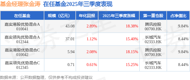 证券之星消息,截止2025年三季度末,基金经理张金涛旗下共管理4只基金,本季度表现最佳的为嘉实港股优势混合A(010041),季度净值涨18.38%。