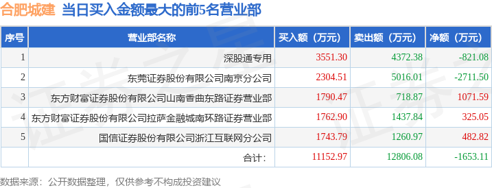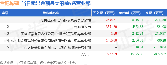 证券之星消息,沪深交易所2025年10月28日公布的交易公开信息显示,合肥城建(002208)因日跌幅偏离值达到7%的前5只证券登上龙虎榜。此次是近5个交易日内第1次上榜。
