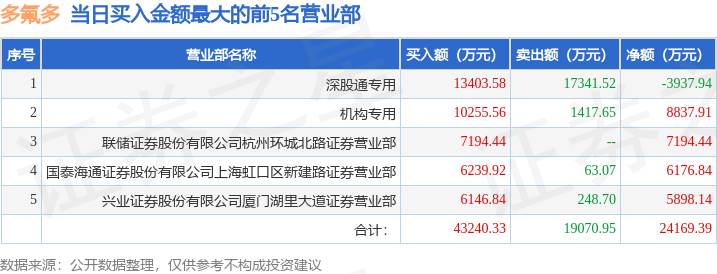 证券之星消息,沪深交易所2025年10月28日公布的交易公开信息显示,多氟多(002407)因日涨幅偏离值达到7%的前5只证券登上龙虎榜。此次是近5个交易日内第1次上榜。