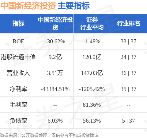 中国新经济投资港股市值9.2亿港元,在证券行业中排名第24。主要指标见下表: