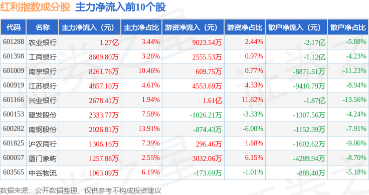 资金流向方面,红利指数(000015)成份股当日主力资金净流出合计6.87亿元,游资资金净流入合计7.95亿元,散户资金净流出合计1.08亿元。成份股资金流向详情见下表: