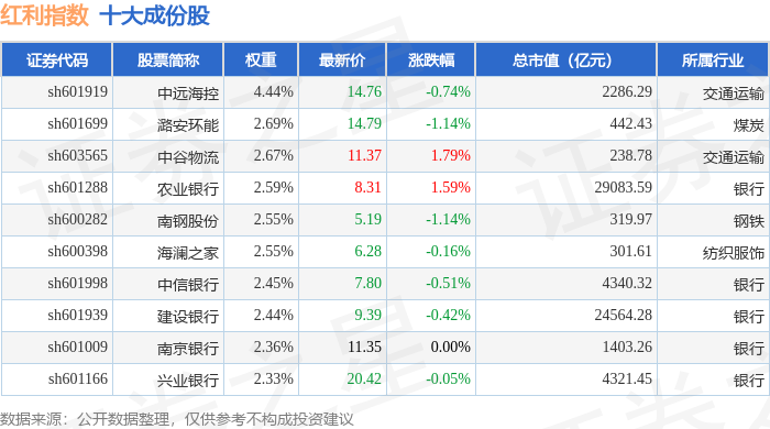 证券之星消息,10月28日,红利指数(000015)报收于3123.65点,跌0.16%,成交290.79亿元,换手率0.28%。当日该指数成份股中,上涨的有13家,厦门国贸以5.25%的涨幅领涨,下跌的有33家,兖矿能源以2.52%的跌幅领跌。