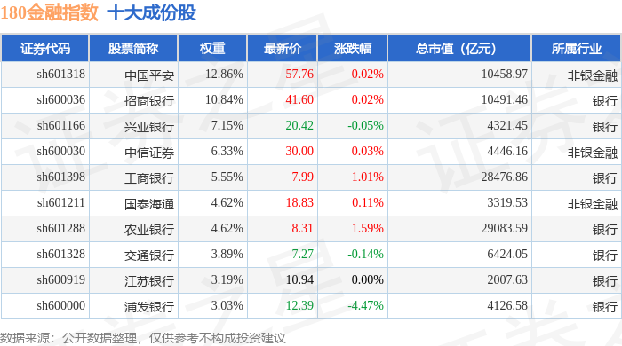 证券之星消息,10月28日,180金融(000018)指数报收于5826.82点,跌0.21%,成交536.14亿元,换手率0.35%。当日该指数成份股中,上涨的有13家,农业银行以1.59%的涨幅领涨,下跌的有26家,浦发银行以4.47%的跌幅领跌。