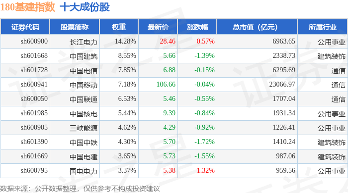 证券之星消息,10月28日,180基建(000025)指数报收于1850.48点,跌0.46%,成交190.77亿元,换手率0.55%。当日该指数成份股中,上涨的有10家,山东高速以1.49%的涨幅领涨,下跌的有20家,中国中冶以4.45%的跌幅领跌。