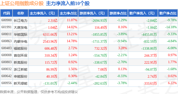 资金流向方面,上证公用(000041)指数成份股当日主力资金净流出合计3.35亿元,游资资金净流出合计335.13万元,散户资金净流入合计3.39亿元。成份股资金流向详情见下表: