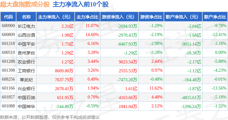 资金流向方面,超大盘(000043)指数成份股当日主力资金净流出合计28.57亿元,游资资金净流入合计18.82亿元,散户资金净流入合计9.75亿元。成份股资金流向详情见下表: