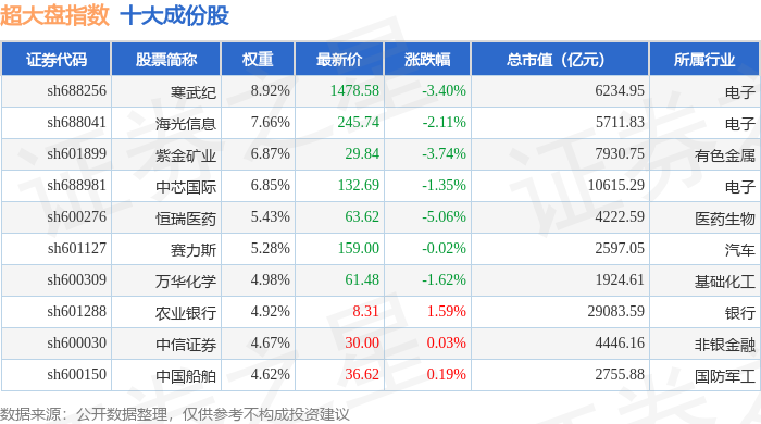 证券之星消息,10月28日,超大盘(000043)指数报收于2685.58点,跌1.02%,成交848.49亿元,换手率0.24%。当日该指数成份股中,上涨的有9家,农业银行以1.59%的涨幅领涨,下跌的有11家,恒瑞医药以5.06%的跌幅领跌。