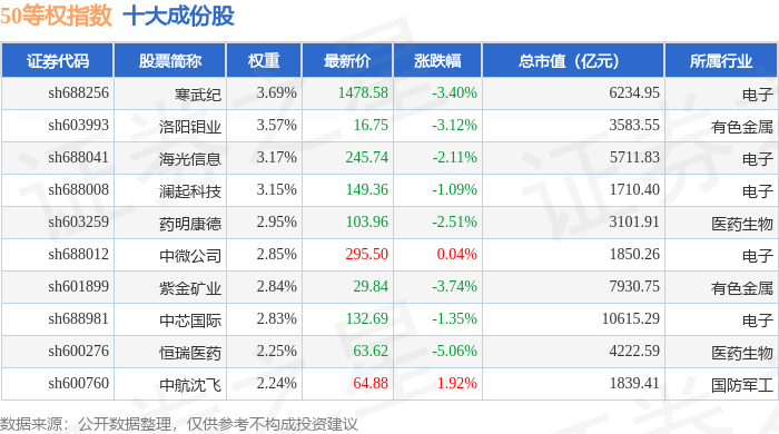 证券之星消息,10月28日,50等权(000050)指数报收于2465.23点,跌0.64%,成交1487.2亿元,换手率0.32%。当日该指数成份股中,上涨的有20家,金山办公以6.38%的涨幅领涨,下跌的有30家,恒瑞医药以5.06%的跌幅领跌。